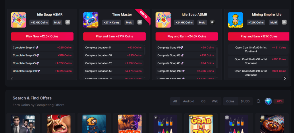 Advanced Tip: Focus on high-value gaming offers (100,000 to 1,000,000+ coins) where you reach specific game levels. Read requirements carefully before starting.