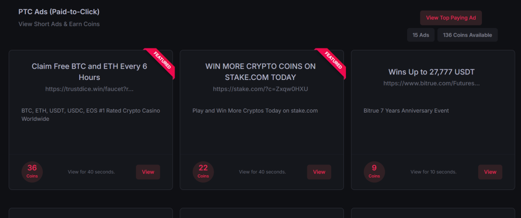 View advertiser websites for 5-30 seconds and earn 5-50 coins per ad. Check multiple times daily as new ads are added regularly.