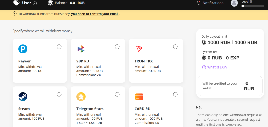 bux.money is an online platform that enables users worldwide to earn supplemental income by completing simple tasks such as watching ads, participating in surveys, testing apps, and engaging with promotional offers. Renowned for its intuitive design and variety of earning options, bux.money attracts both beginners and experienced online earners looking for flexible ways to make money from home. The platform mainly pays in rubles and supports popular payment processors, catering to users in multiple countries with region-specific offers.