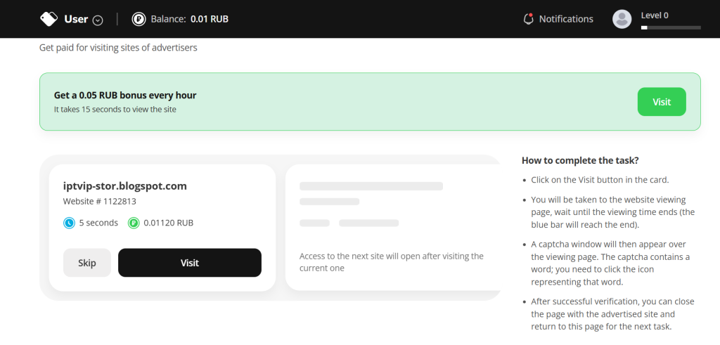 Users click on advertisements, view them for a designated time (commonly 10 to 30 seconds), and earn small amounts per ad. This is the quickest way to accumulate earnings on the platform.