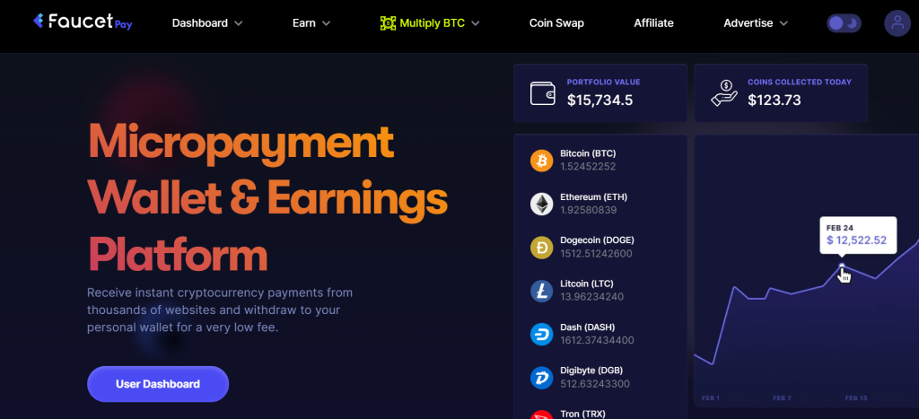 FaucetPay is a global, user-friendly micropayment wallet that supports multiple major cryptocurrencies, including Bitcoin (BTC), Ethereum (ETH), Litecoin (LTC), Dogecoin (DOGE), Dash, Bitcoin Cash (BCH), Tron (TRX), and Tether (USDT). It functions as both an online wallet and a platform for earning free crypto in small (micro) amounts from hundreds of partnered faucets, PTC ad sites, games, offerwalls, and survey partners. Funds are instantly credited to your FaucetPay wallet, where you can manage, swap, send, or withdraw them.