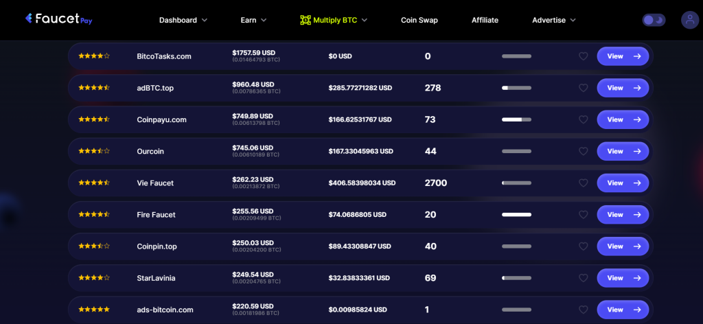 - Find a list of partnered faucets in the FaucetPay “Earn” tab.