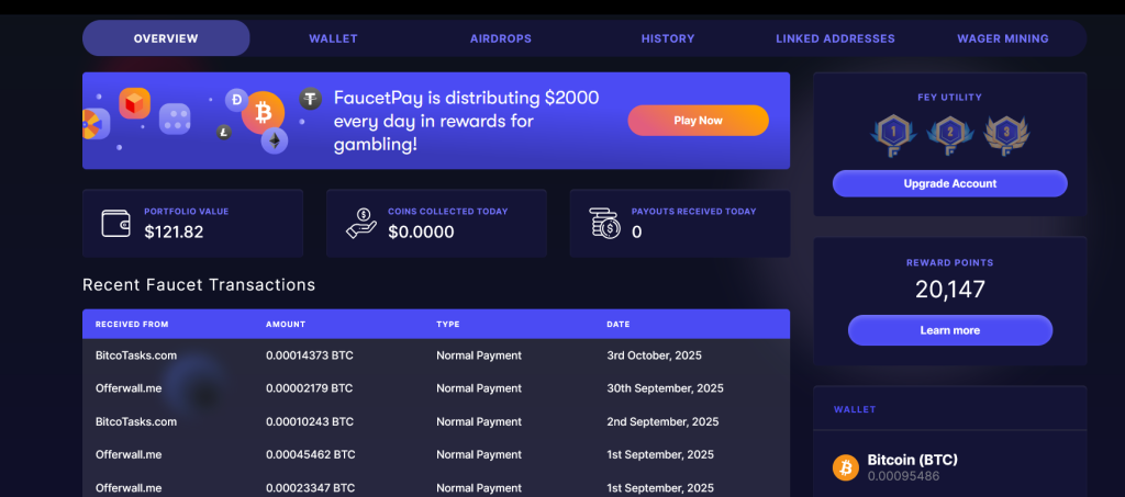 FaucetPay partners with hundreds of faucets that reward users with small crypto amounts for simple actions, such as solving captchas or claiming bonuses. You can claim rewards as often as the faucet permits, and funds are credited instantly to your FaucetPay wallet.