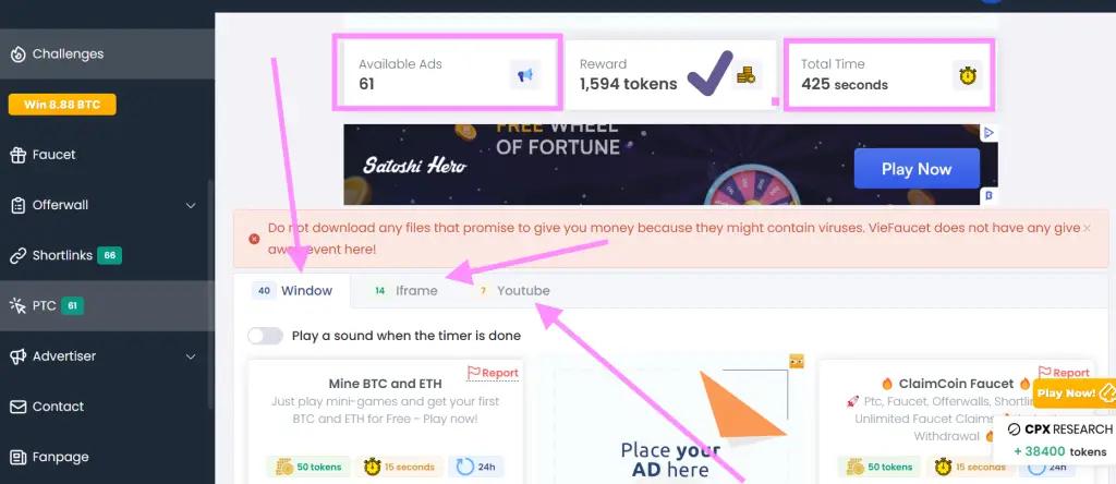 - Iframe Ads: Require watching the advertisement for a specific duration