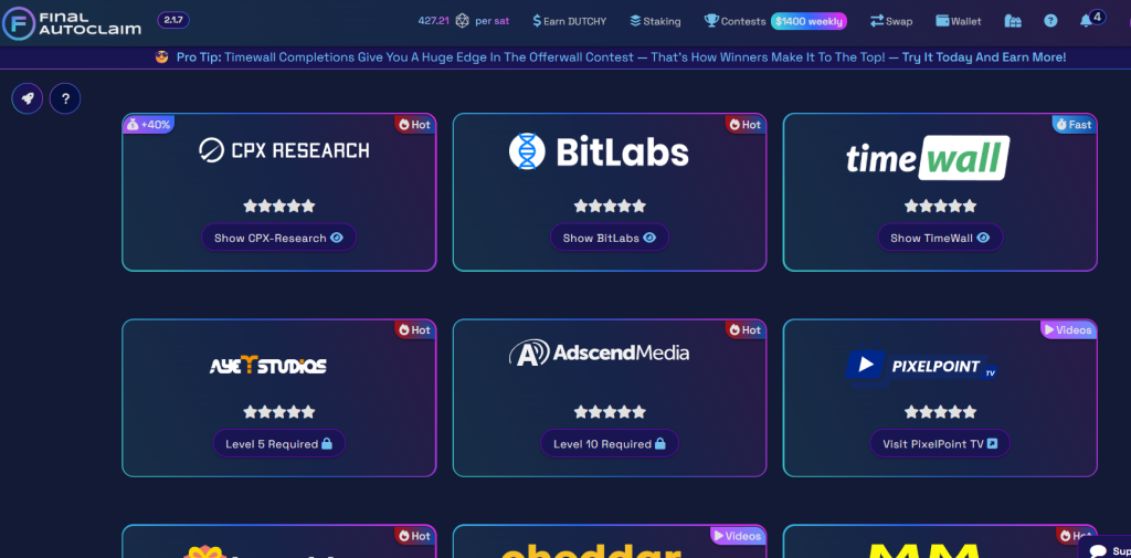 - Offerwalls & Surveys: Complete offers, signups, and surveys for bonus Dutchy.