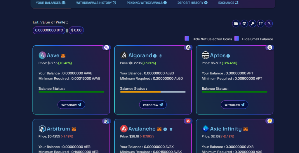Each cryptocurrency has its own payout minimum—Bitcoin, Ethereum, Dogecoin, Polygon, and more are supported. Withdrawals are fast, require no fees if using Dutchy-powered faucet (a small fee for direct instant swaps), with rates updated every 30 minutes to match live market prices.